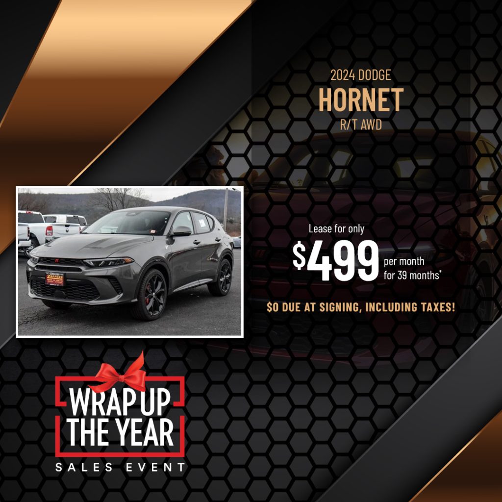 Float like a butterfly, sting like a bee, drive like a Hornet! Elevate your every drive with unbeatable performance and handling behind the wheel of an exceptional new 2024 Dodge Hornet R/T All Wheel Drive! Feel the thrilling sting of the quickest PHEV Compact Crossover in it’s class that can reach up to 60 mph in just 5.6 seconds! And for a limited-time during the Wrap Up The Year Sales Event here at Zappone CJDR you can claim a special offer on this awesome ride! Explore our available offers below, find the right offer for you, and stop into our dealership at 8556 State Route 22, Granville, NY 12832, to pick up your new 2024 Dodge Hornet today!