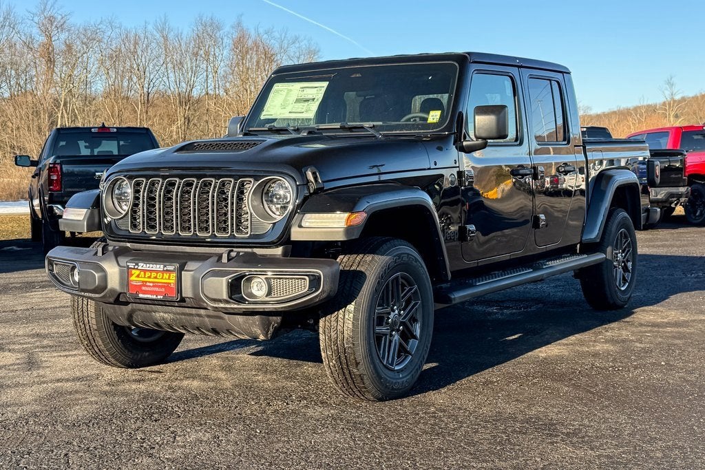 Zappone Chrysler Jeep Dodge Ram of Granville is pleased to offer this superb 2026 Jeep Gladiator Sport S in Black Clearcoat Beautifully equipped with Convenience Group (Air Conditioning with Auto Temp Control, Cluster 7.0 TFT Color Display, Corning Gorilla Glass, Daytime Running Lamp System, Emergency/Assistance Call, Front Door Locks 2-Door Passive Entry, Heated Front Seats, Heated Steering Wheel, Remote Start System, and Universal Garage Door Opener), Dark Sky Appearance Package (2-Piece Body Color Fender Flares, Mold in Color Bumper with Gloss Black, and Performance Hood), LED Headlamp and Fog Lamp Group (Daytime Running Lamps LED Accents, Front LED Fog Lamps, and LED Premium Reflector Headlamps), Quick Order Package 24S Sport S (Advanced Brake Assist, Automatic Headlamps, Deep Tint Sunscreen Windows, Full Speed Forward Collision Warning Plus, Normal Duty Plus Suspension, Power Heated Mirrors, Premium Wrapped Steering Wheel, Security Alarm, Sun Visors with Illuminated Vanity Mirrors, and Wheels: 17 x 7.5 Gray), 110 Mph Vehicle Max Speed Calibration, 12.3 Touchscreen Display, 3.73 Rear Axle Ratio, 4-Wheel Disc Brakes, 4G LTE Wi-Fi Hot Spot, 8 Speakers, ABS brakes, Air Conditioning, Alexa Built-in, AM/FM radio: SiriusXM with 360L, Apple CarPlay, Apple CarPlay/Android Auto, Body Color 3-Piece Hard Top, Brake assist, Compass, Connectivity - US/Canada, Delay-off headlights, Driver door bin, Driver vanity mirror, Dual front impact airbags, Dual front side impact airbags, Electronic Stability Control, For Details, Visit DriveUconnect.com, Freedom Panel Storage Bag, Front anti-roll bar, Front Bucket Seats, Front Center Armrest w/Storage, Front fog lights, Front License Plate Bracket, Front reading lights, Google Android Auto, Illuminated entry, Integrated Center Stack Radio, Integrated roll-over protection, Low tire pressure warning, MOPAR All-Weather Slush Mats, Mopar Black Tubular Side Steps, MOPAR Soft Tri-Fold Tonneau Cover, MOPAR Spray in Bedliner, MyFlexCare Service Plan, Normal Duty Suspension, Occupant sensing airbag, Outside temperature display, Overhead airbag, Panic alarm, ParkView Rear Back-Up Camera, Passenger door bin, Passenger vanity mirror, Power steering, Power windows, Radio data system, Radio: Uconnect 5 with 12.3 Display, Rear anti-roll bar, Rear reading lights, Rear Sliding Window, Rear Window Defroster, Remote keyless entry, SiriusXM Radio Service, SiriusXM with 360L, Speed control, Split folding rear seat, Steering wheel mounted audio controls, Tachometer, Telescoping steering wheel, Tilt steering wheel, Traction control, Trip computer, USB Host Flip, Variably intermittent wipers, Voltmeter, and Wheels: 17 x 7.5 Black Steel Styled!